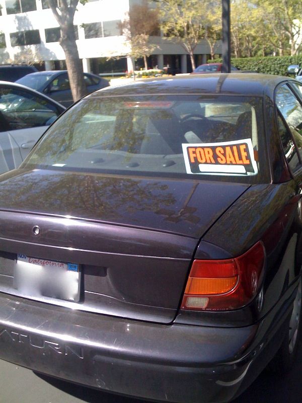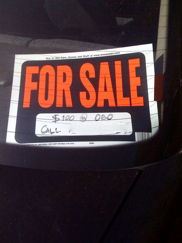 >The ol’ for sale sign in your car. One of my co-workers in SFO is regularly teased about his car, two other co-workers took it one more step: